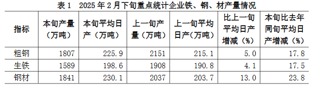 2025年2月下旬,重點(diǎn)統(tǒng)計(jì)鋼鐵企業(yè)共生產(chǎn)粗鋼1807萬(wàn)噸,平均日產(chǎn)225.9萬(wàn)噸,日產(chǎn)環(huán)比增長(zhǎng)5.0%;生鐵1589萬(wàn)噸,平均日產(chǎn)198.6萬(wàn)噸,日產(chǎn)環(huán)比增長(zhǎng)4.1%;鋼材1841萬(wàn)噸,平均日產(chǎn)230.1萬(wàn)噸,日產(chǎn)環(huán)比增長(zhǎng)13.0%(見(jiàn)表1)1。