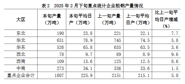 2月下旬六大地區(qū)重點(diǎn)統(tǒng)計(jì)企業(yè)粗鋼日產(chǎn)量較上一旬均有不同程度增長(zhǎng)(詳見(jiàn)表2),具體為: