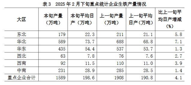 2月下旬六大地區(qū)重點(diǎn)統(tǒng)計(jì)企業(yè)生鐵日產(chǎn)量較上一旬均有不同程度增長(zhǎng)(詳見(jiàn)表3),具體為: